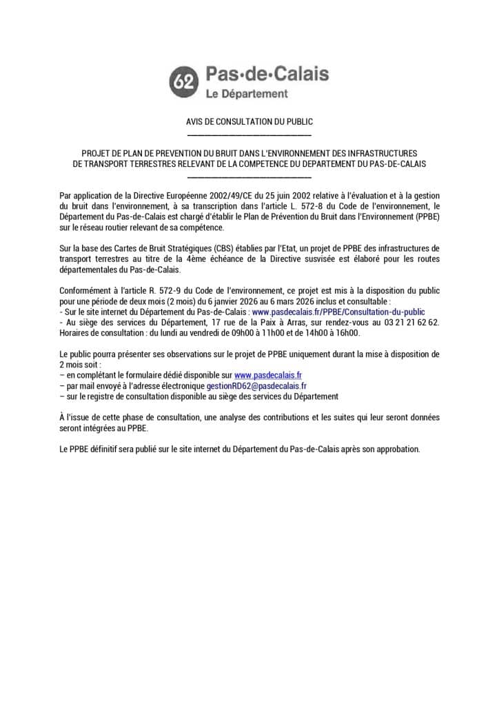 Le Département du Pas-de-Calais lance une consultation officielle concernant son projet de Plan de Prévention du Bruit dans l’Environnement (PPBE). Ce document, qui concerne les infrastructures de transport terrestres relevant de la compétence départementale, est élaboré sur la base des Cartes de Bruit Stratégiques établies par l’État.